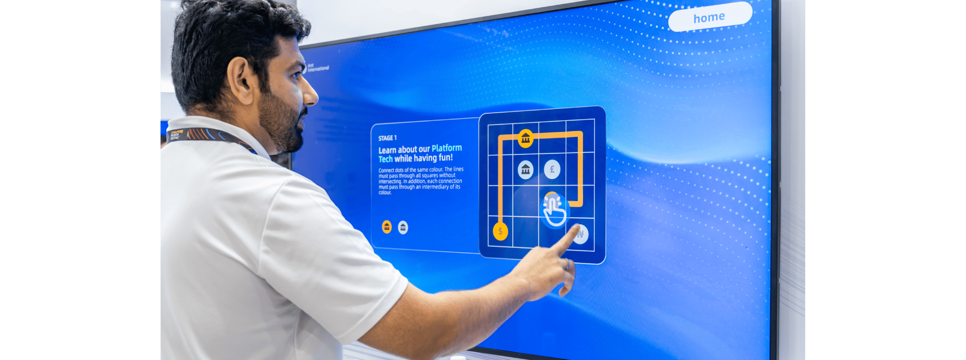 Players connect pairs of matching icons (colors and currency symbols) by drawing a line between them.